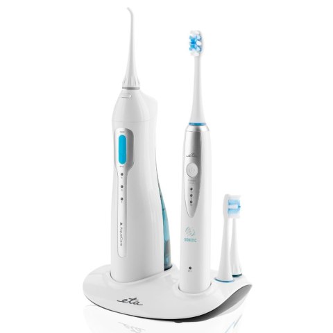 Wyposażenie dodatkowe: Szczoteczka soniczna i irygatora, 3 końcówki do szczoteczei w różnych kolorach, 3 dysze irygatora w różnych kolorach, 1 końcówka do czyszczenia języka, 1 dysza ortodontyczna do czyszczenia stałego aparatu ortodontycznego